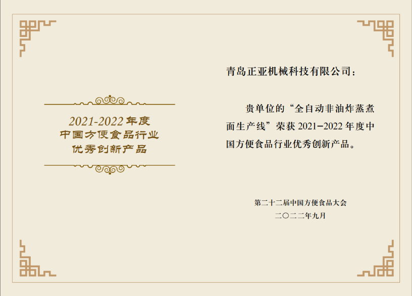 我司作為參會(huì)方,非常榮幸的在第二十二屆中國方便食品大會(huì)以“全自動(dòng)非油炸蒸煮面生產(chǎn)線”榮獲2021-2022年度中國方便食品行業(yè)優(yōu)秀創(chuàng)新產(chǎn)品獎(jiǎng)。